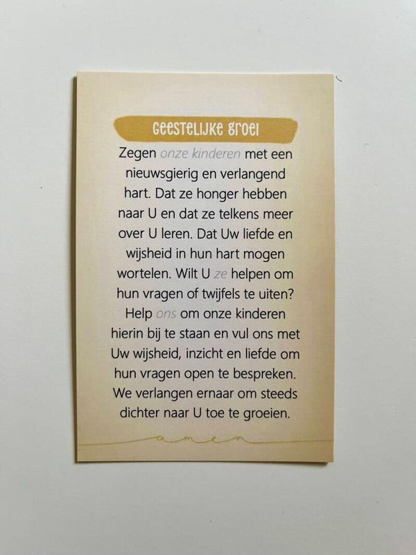 In de set zitten 30 kaarten: een gebed voor elke dag van de maand. Zo weet je zeker dat je voor al deze belangrijke thema's in ieder geval één keer per maand bidt!